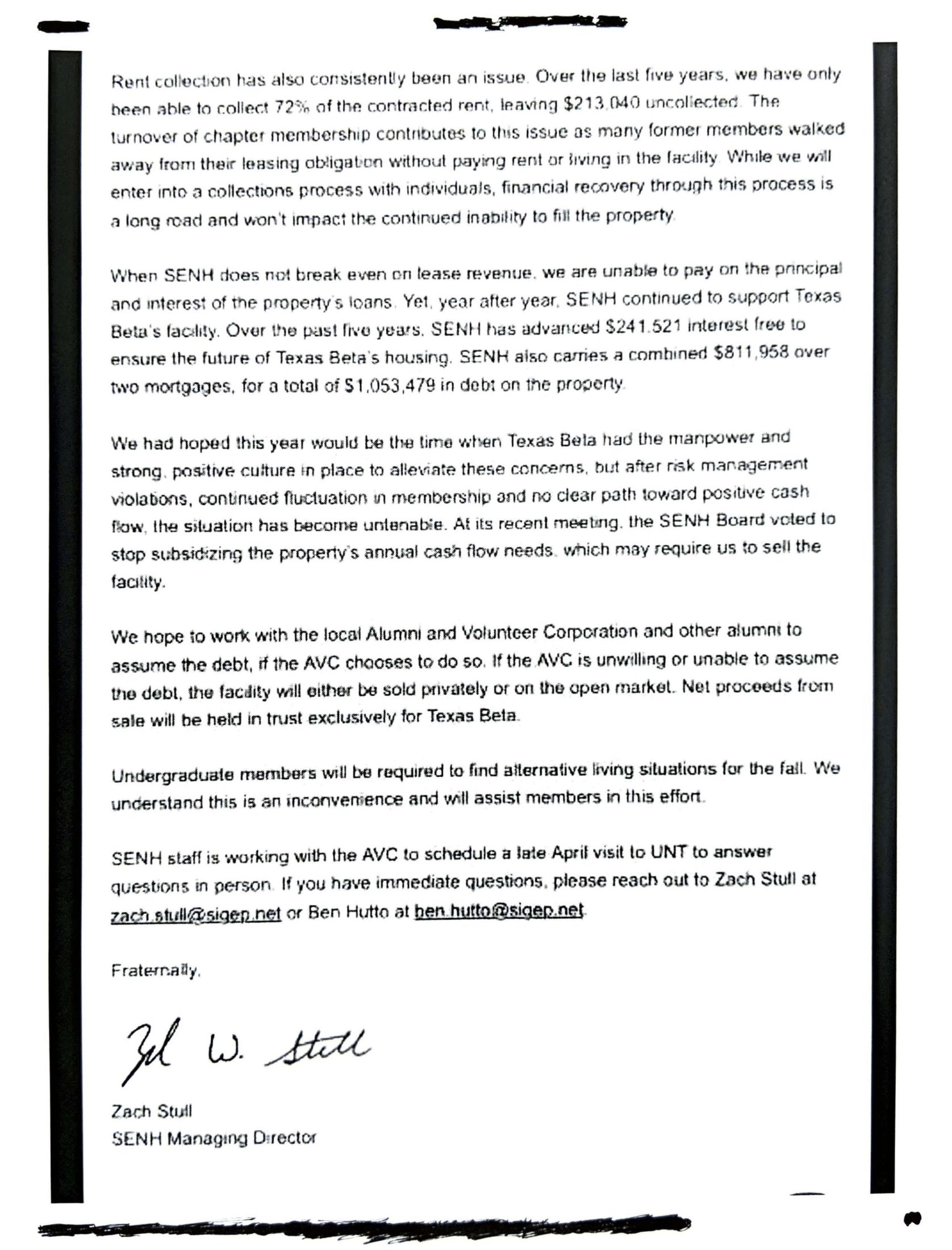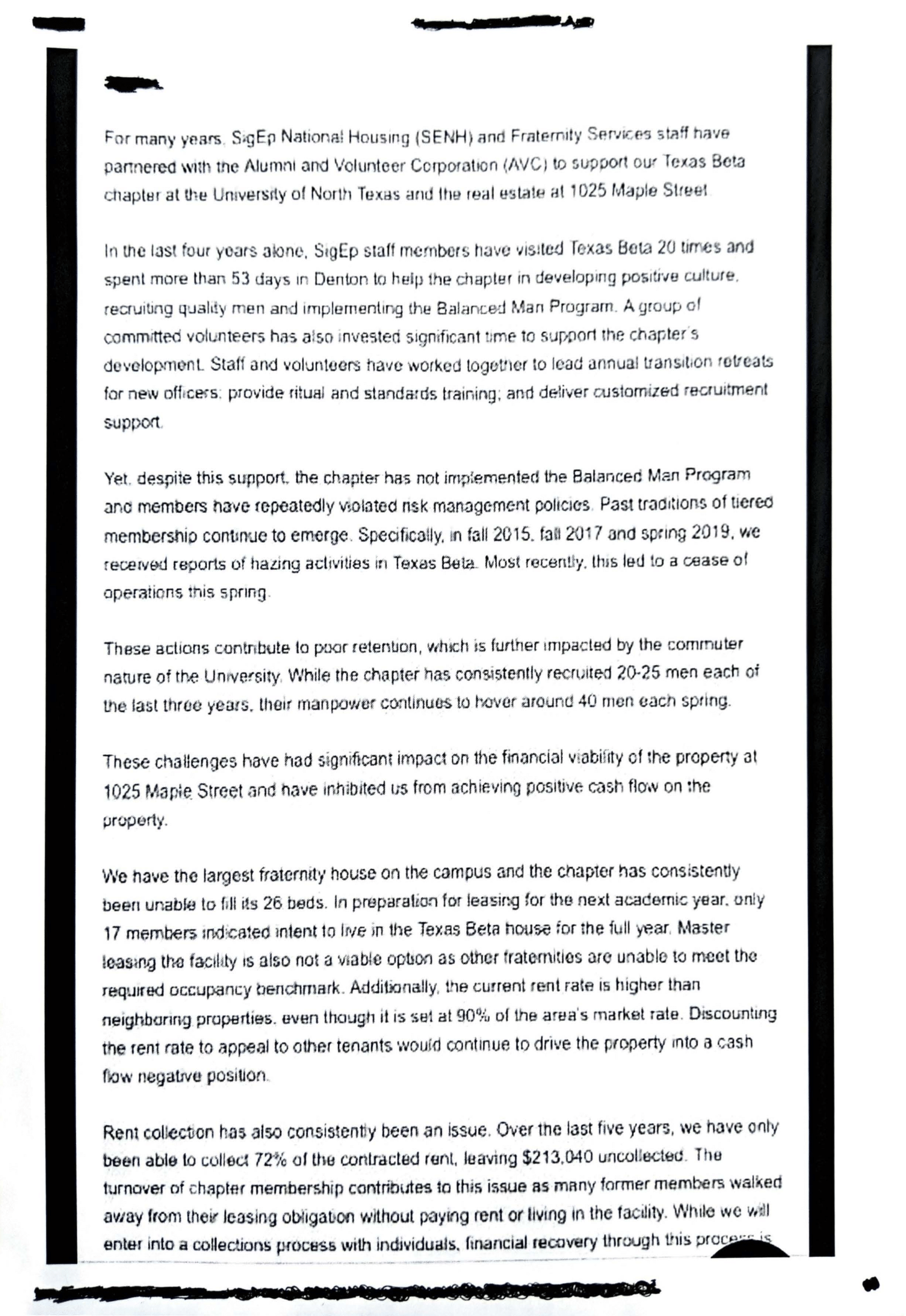 Kirk was also asked to comment on what appeared to be Sigma Phi Epsilon National Housing memos that referenced the fraternity failing to implement the Balanced Man Program, being in debt and receiving reports of hazing in Fall 2015, Fall 2017 and Spring 2019.