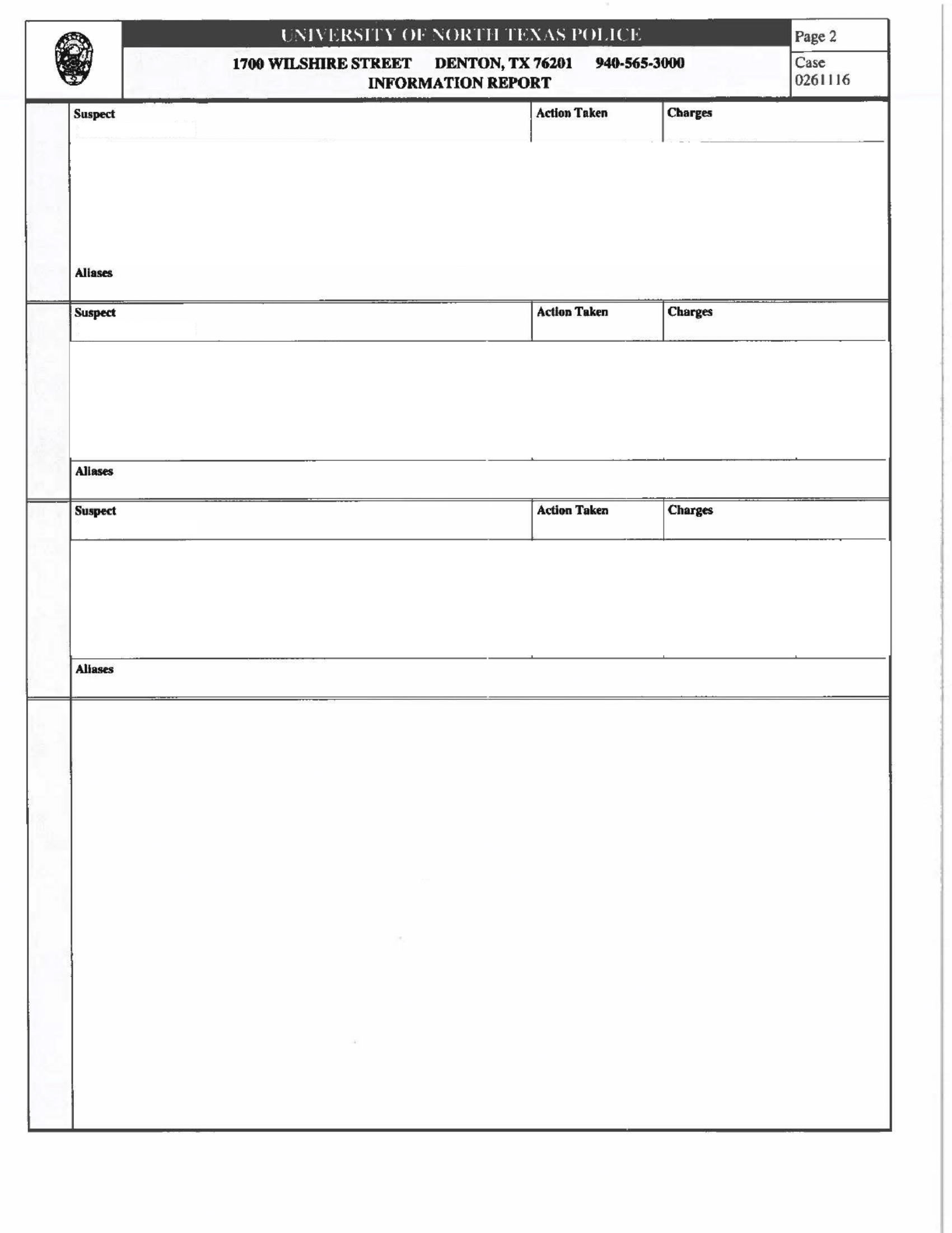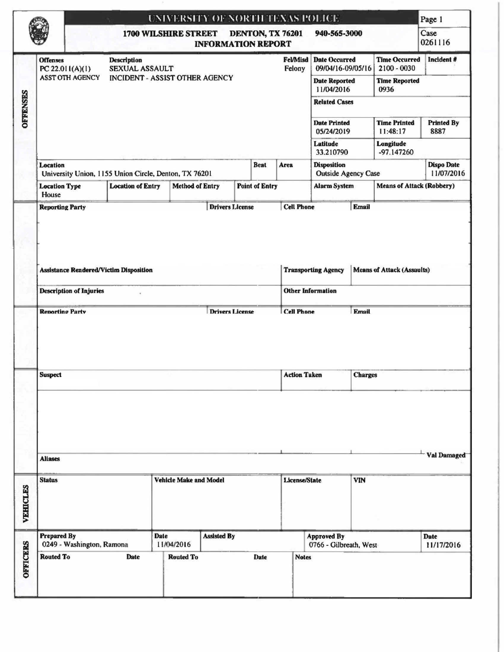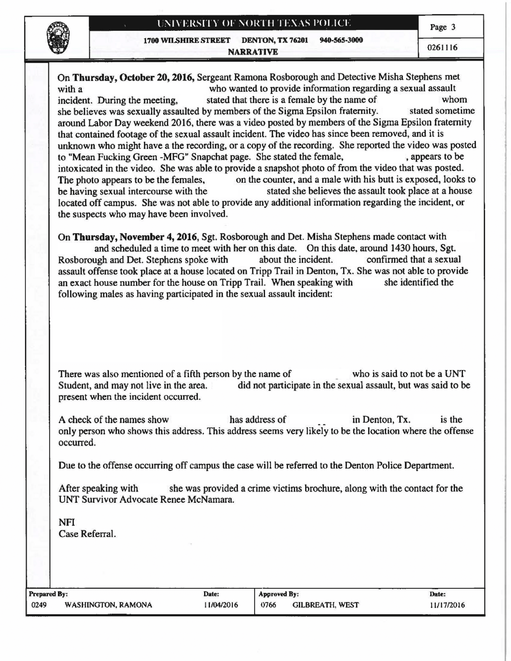 The Denton Police Department received the 2016 case since the alleged offense occurred off-campus and attempted to contact the alleged victim who communicated that she did not want to pursue the case, said City of Denton Police Chief Frank Dixon.